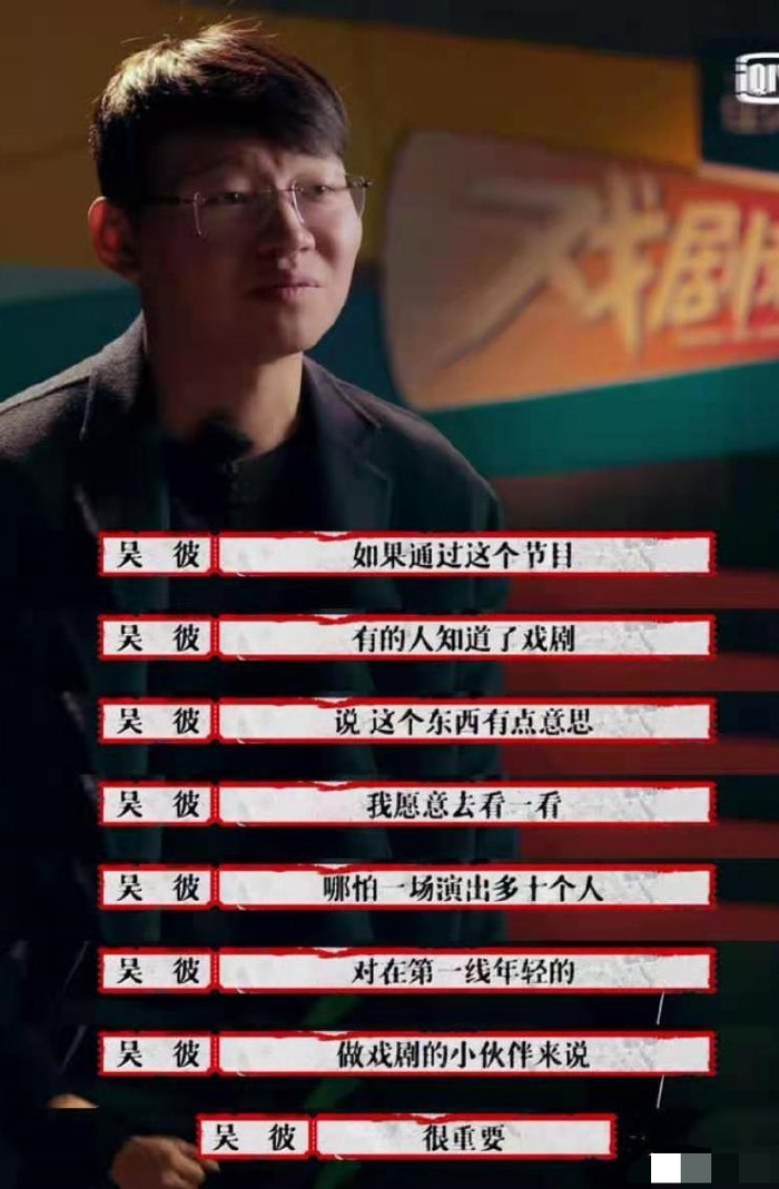 但仅有真人秀是不够的。就像吴彼就很清醒地说,“就你们是一帮没名气的人,你们可以插科打诨,你们就再有人格魅力,最后‘嘣噔’一扔出来,是一个什么也不是……活该,你们就配这。”不少明星虽然干啥啥不行,但如果有颜值有综艺感,公众的宽容度就很高。可戏剧人对于普通观众来说,约等于路人,如果他们没干货没实力,哪怕他们再有趣,观众也没那个耐心看一期长达两三个小时的综艺。