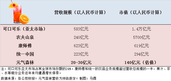 元气森林对外公布过2020年1月到5月的营收为6.6亿元,2021全年营收目标是75亿元,我们推测元气森林2020年营收可能在20-30亿元的规模,可以与大型饮料公司的营收规模做一个比较:
