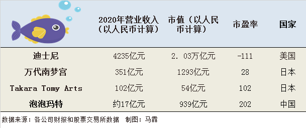 目前资本市场基于潮玩公司向IP开发、娱乐、游戏业发展的想象空间,对标迪士尼这样的娱乐业巨头,给了泡泡玛特高达202倍的市盈率,但它的营收和其他老牌娱乐、游戏及潮玩公司相比还是一个很小的数字。