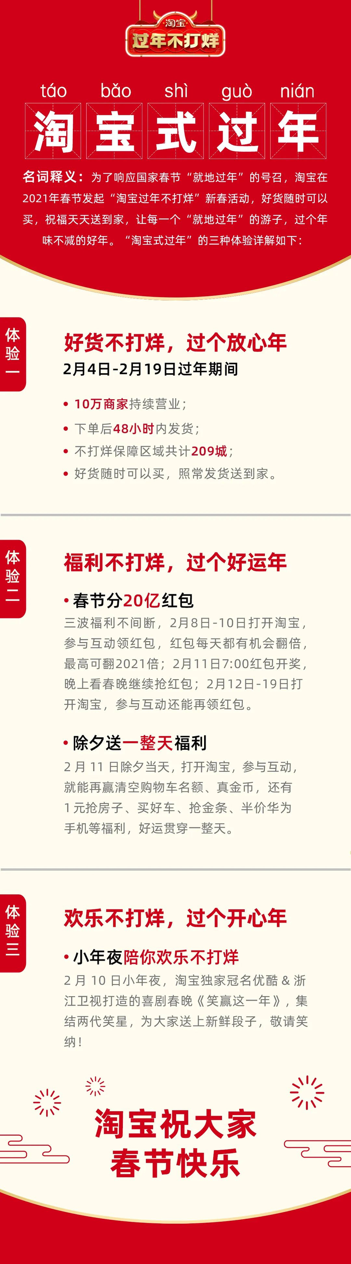 2月4日-2月19日过年期间,淘宝“好货不打烊,过个放心年”,10万淘宝商家持续营业;用户下单后48小时内发货;春节假期好货随时可以买,照常发货送到家。