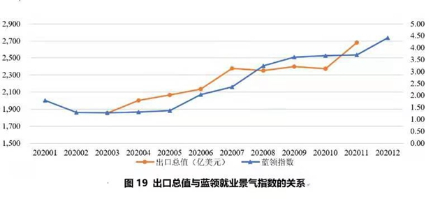 曾湘泉称,出口总值与蓝领就业景气指数相关,蓝领指数的波动趋势和出口总值的波动趋势相似,但是整体上滞后于出口总值的变动。随着出口总值扩大,蓝领就业景气指数提升,表明随着制造业海外订单大幅增加,加上季节因素的影响,招聘需求同比大幅上涨,蓝领指数也大幅上升。