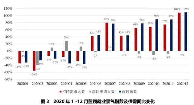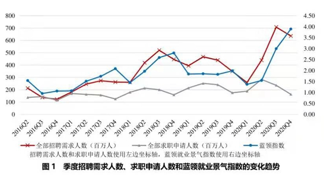 报告显示,受到疫情影响,2020年春节前后,蓝领就业景气指数最低;第二季度开始逐渐恢复,4月到12月蓝领指数持续上升,并在12月达到历史新高。