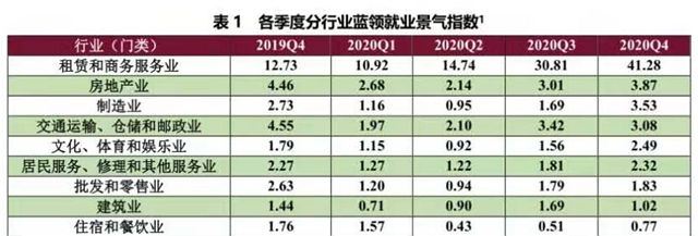 报告称,住宿业自2020年第二季度进入就业景气指数排名后10的行业中后,直到第四季度,住宿业的蓝领指数排名才有所上升。