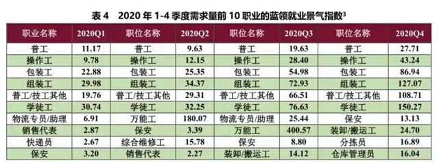报告显示,2020 年一至四季度用工需求量位于前列的是普工、操作工、包装工和组装工。