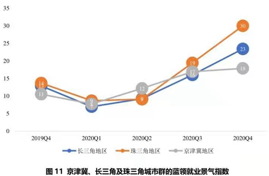 从城市群来看,外贸企业聚集的长三角、珠三角对蓝领的需求增幅明显。2020年第四季度,长三角城市群招聘需求人数同比增加55.31%,珠三角城市群招聘需求人数上涨幅度最大,为72.37%。