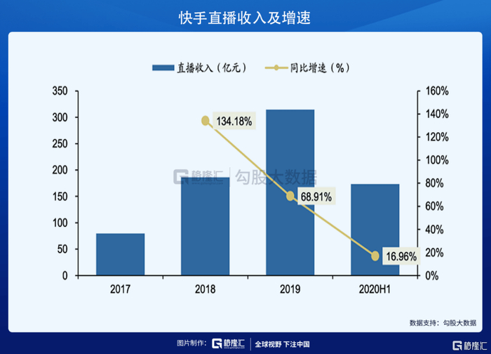按收入来说,快手是中国最大的直播平台,但直播业务由于其生态和天花板的问题,增速已经开始逐步下滑,2020年上半年增速只有17%。