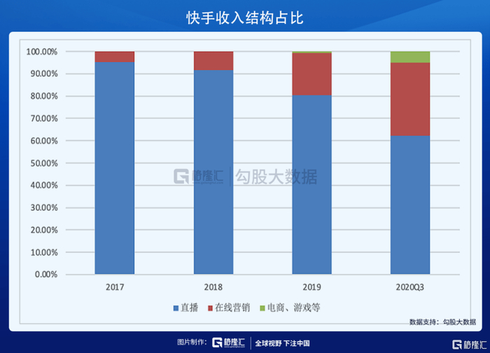 从快手的收入结构看,2018年之前,直播业务贡献了超过90%的营收,从2019年开始,在线营销和电商的收入占比才开始快速扩大。到了2020年Q3,在线营销的收入占比已经占到了近40%,占比快速扩大,按照这样的增速到了2021年,占比就将铁定超过50%。