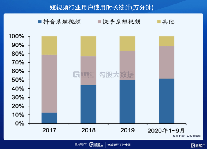而在所有用户时长的统计中,抖音和快手,分掉了约九成的用户时间。