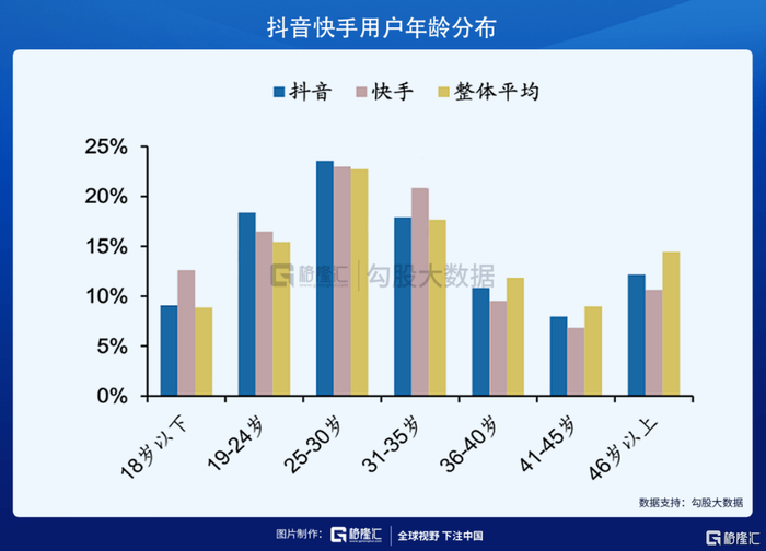 而在用户年龄上,抖音快手都集中在19-35岁的年轻用户中,只不过抖音在19-24岁用户中有优势,而快手则在31-35岁用户中有优势。