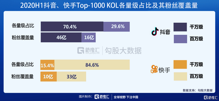 从粉丝分布看,抖音粉丝呈“二八”分布,粉丝集中在头部账号,而快手粉丝中腰部力量雄厚,粉丝与账号之间关系更紧密。