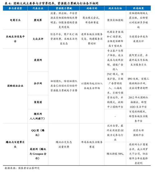 棋子变棋手:鸿鹄之志,夹缝中绝处逢生。团购大战下半场是资本的博弈,创业企业本质上是互联网三巨头博弈的棋子。美团交易导向的平台发展依赖持续的流量供给,腾讯的资源禀赋更契合。美团不甘于人下遇上阿里的全面并购文化,腾讯是更好的选择。团创始团队的野心绝非屈尊于任何一方,成为一方生态中的一部分,因此腾讯相对松散的流量赋能体系更适合有志成为独立一极的美团进一步发展壮大。
