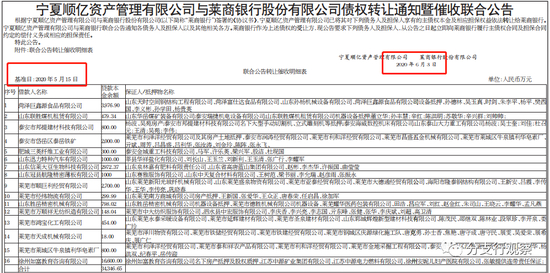 2020年6月3日,宁夏顺亿资产管理有限公司与莱商银行发布《债权转让通知暨催收联合公告》。根据宁夏顺亿资产管理有限公司与莱商银行签署的《协议书》,宁夏顺亿资产管理有限公司已将其对下列债务人及担保人享有的主债权本金及相应担保权益依法转转让给莱商银行。宁夏顺亿资产管理有限公司与莱商银行联合公告通知各债务人及担保人以及其他相关各方。莱商银行作为上述债权的受受让方,现公告要求下列债务人及担保人,从公告之日起立即向莱商银行履行主债权合同及担保合同约定的偿付义务或相应的担保责任。