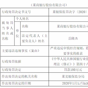 随着日照岚山支行、济南济阳支行相继获批开业后,2021年1月14日,莱商银行又迎来李华珍、常永峰两位新任行长助理。一年前也就是2020年1月14日,莱商银行股份有限公司因严重违反审慎经营规则、隐瞒重要事实的报表,依据《中华人民共和国银行业监督管理法》第四十六条,莱芜银保监分局对该行处以罚款180万元。