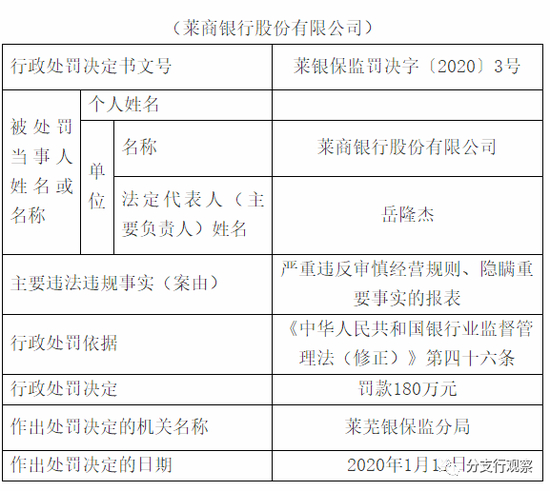 12月18日,中国人民银行莱芜市中心支行公布莱银处罚公示〔2020〕第3号行政处罚信息公示表,显示莱商银行股份有限公司超过期限或未向中国人民银行报送单位银行结算账户开立、撤销资料;超过期限或未向中国人民银行报送个人银行结算账户开立资料;与客户建立业务关系或办理一次性金融业务,未按规定识别客户身份。