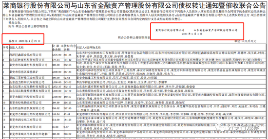 2020年6月4日,莱商银行股份有限公司与山东省金融资产管理股份有限公司发布《债权转让通知暨催收联合公告》。根据莱商银行与山东省金融资产管理股份有限公司签署的《债权转让协议》,莱商银行已将其对下列债务人及担保人享有的主债权及及担保合同项下的全部权益依法转让给山东省金融资产管理股份有限公司。莱商银行与山东省金融资产管理股份有限公司联合公告通知各债务人及担保人以以及其他相关各方。山东省金融资产管理股份有限公司作为上述债权的受让方,现公告要求下列债务人及担保人,从公告之日起立即向山东省金融资产管理股份有限公司履行主债权合同及担保合同约定的偿付义务或相应的担保责任。