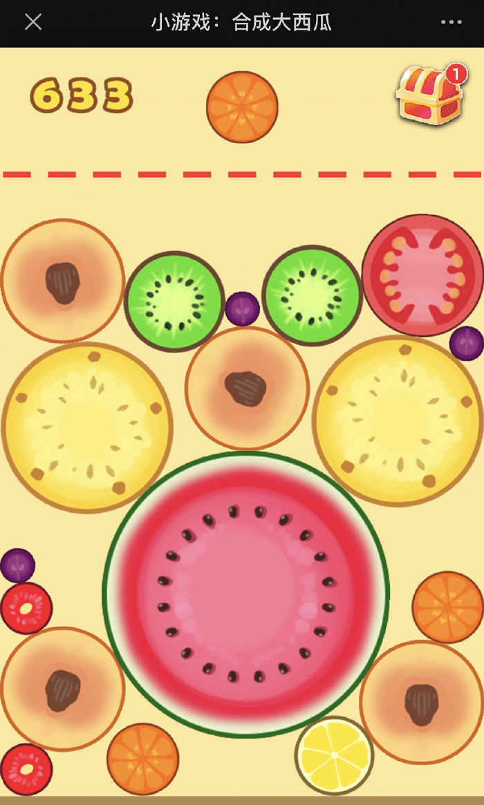 “爽点”就是小瓜大瓜对对碰的连锁反应,瞬间制造出一个巨大的空间。兼具了《开心消消乐》的爽感与《2048》的益智感。从葡萄、橙子、柠檬、猕猴桃、桃子、到石榴、西瓜……或许大部分玩家不会自主点进《合成大西瓜》的链接,但在社交圈的带动下,“我不玩,我就进去看看”之后,“真香”的停不下来的情况,已经并不罕见。