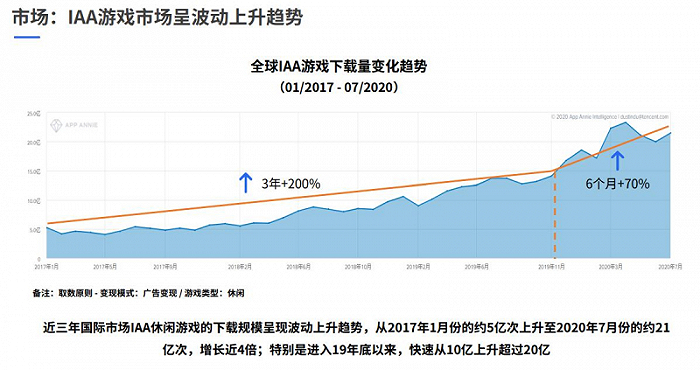2020“爆量学园”IAA游戏课程曾提供一组数据:2017年-2019年这段时间,IAA市场游戏下载量翻了3倍不止,这个数据说明人们对于IAA的消费量级是一个持续增长的状态。