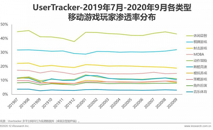 艾瑞分析数据也显示,2019年7月到2020年9月各类型移动游戏玩家渗透率分布中,休闲游戏和棋牌游戏仍保持前两位,表明中国游戏市场中仍存在大量的轻度玩家。