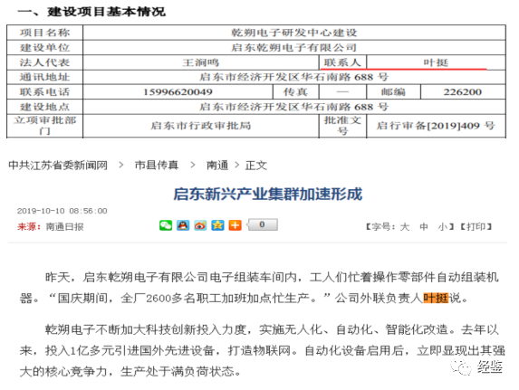 另据公开信息显示,叶挺为启东乾朔外联负责人,2013年叶挺与他人分别成立了启东乾朔物流有限公司、启东乾德物流有限公司两家公司,前者于2015年注销,后者则于2020年被吊销。