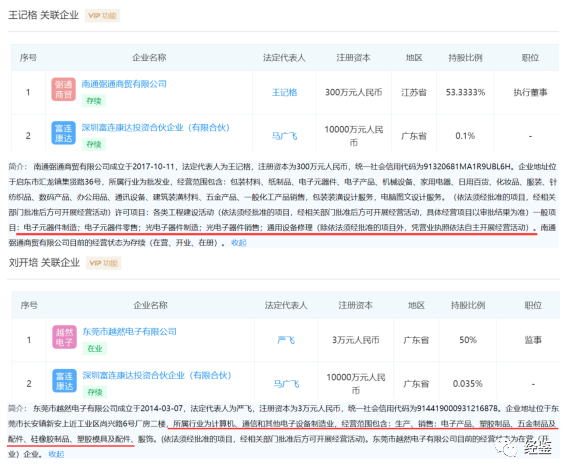 工商资料显示,王记格目前为南通弼通商贸有限公司法定代表人,该司与乾德电子的业务紧密相连;而刘开培目前为东莞市越然电子有限公司监事,占股50%,该司同样与乾德电子业务紧密相连。