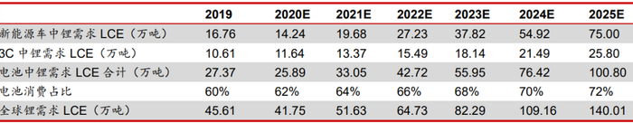 根据GGII的数据,2019年全球锂需求中有60%为电池中的需求,按照电池消费占比和电池中锂需求LCE(固/液锂矿中能够实际生产的碳酸锂折合量)数据,2021、2022年全球的锂需求测算为51.63万吨、64.73万吨LCE。