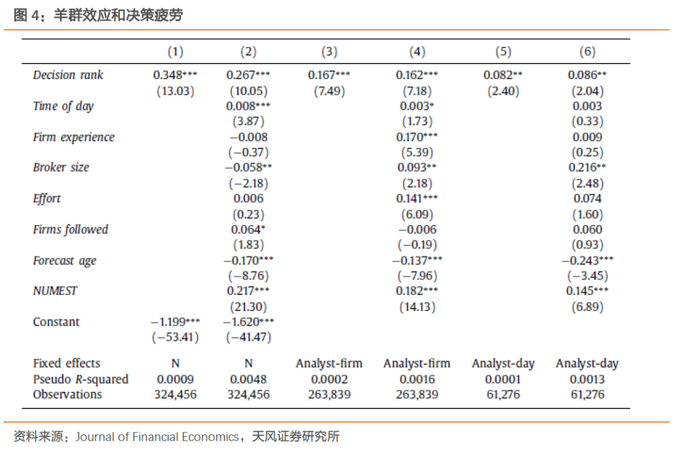 为了检验第二个假设检验,本文使用条件概率形式的逻辑回归,控制了分析师-日期固定效应,结果入下表中的列5和列6所示,与假设相一致,分析师更容易按照序列决策集群,回归的系数为0.086,在5%的置信水平下显著。