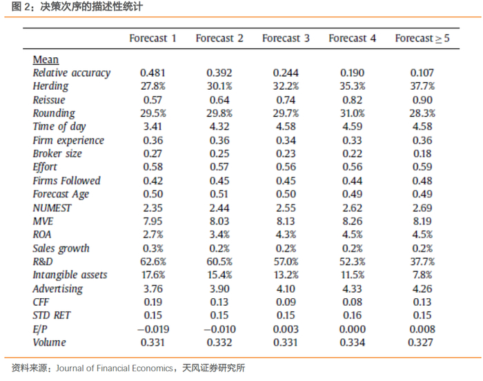 其中本文的关键自变量 是分析师当天已经披露的预测数量加1的自然对数;控制变量包含分析师覆盖公司数量、中介商规模、分析师从业年限等。