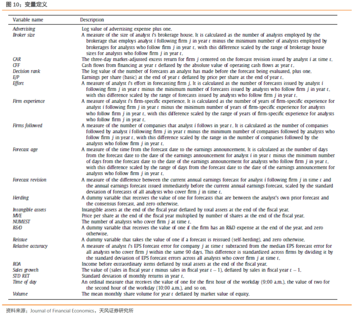Clement (1999)的研究表明分析师能力、可利用资源等都显著影响盈利预测的精度,当分析师的从业年限越长、雇主的规模越大时,分析师盈利预测的精度将越高;而当分析师覆盖的股票数量越多时,分析师的预测精度将下降。