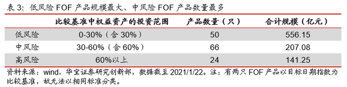 FOF产品在招募书中都进行了投资范围和投资约束的限制,并且设置了比较基准,而投资过程中在满足投资约束的前提下,进行灵活配置。值得说明的是,对于目标日期型养老FOF产品,投资者如果按照当前时点买入,则按照当前所处的下滑曲线的阶段确定权益投资的比例。我们将按照比较基准中权益部分的配置比例高低,将公募FOF划分为0-30%,30%-60%,60%以上,分别对应着低风险、中等风险、高风险型FOF产品。