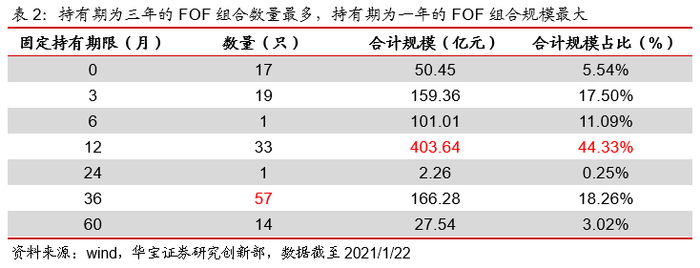 FOF产品定位为长期投资,因此当前发行的产品主要以固定持有期为主要运作方式,按照最短固定持有时间的不同可以进一步划分。当前,持有期为三年的FOF产品数量最多,共57只,其中36只为目标日期型养老FOF,其余为目标风险型养老FOF,此类产品虽然数量多,但是并不是最受投资者青睐的。从规模上看,投资者最偏好持有期为一年的FOF产品,合计规模占比接近45%。同时我们也注意到,持有期为6个月的产品虽然只有民生加银卓越配置一只,但是该产品的规模达到了101.01亿元,占全体FOF产品的11.09%,是当前规模第二大的公募FOF。另外,从每一类别中产品的平均规模来看,投资者对FOF产品的偏好在持有期一年及以内的产品上更集中。