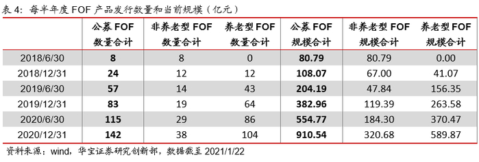FOF定位于集大类资产配置策略、权益固收商品等各类资产细分赛道投资于一体的综合性投资产品,能够给投资者提供一整套完整基金投资方案。截至2020年12月31日,市场上已成立公募FOF共142只,合计规模为910亿。其中,以养老为目标的养老FOF产品占绝大比例(数量占比73.2%,规模占比64.8%)。