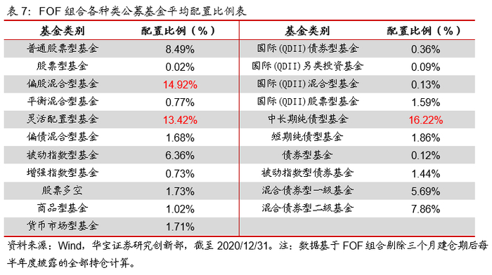 从上表的数据中可以看出,公募FOF最偏爱的公募基金类型是:中长纯债型基金、偏股混合型基金、灵活配置型基金。对于理论上能提供低相关性另类资产,如商品、量化对冲、海外QDII等品种的配置较低,主要原因近两年权益市场收益具有明显优势,其他资产配置价值有限,另一方面在于当前FOF产品的运作时间较短,而资产配置策略的价值需要较长的时间周期才能得以发挥,为此,我们将持续关注。