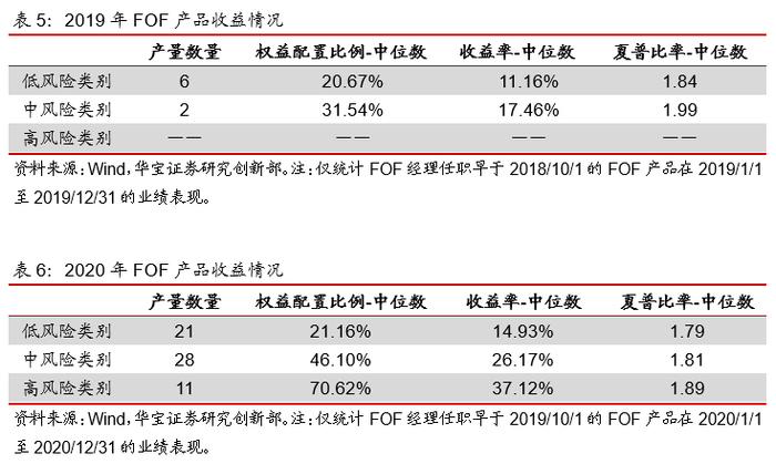 得益于权益资产自2019年初至2020年底的良好表现,在2019年与2020年中不同风险水平FOF产品的收益率中位数与权益配置比例中位数呈明显的线性关系,同时产品整体的风险调整后收益特征也被组合中的权益部分所主导,因而不同风险水平的FOF产品的夏普比率中位数基本接近,这也说明了投资中风险与收益的同源关系。