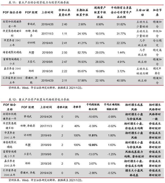 对于值得关注的重点FOF产品,我们将它们的各项投资能力指标以及投资风格描述列示在下表中,从收益来源和收益归因的角度对这些产品特征进行评判: