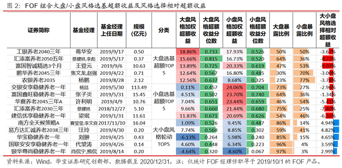分别使用中证100、中证1000指数作为大盘、小盘风格的基准指数来计算FOF组合的风格加权超额收益、风格超额收益分位数、风格选择相对超额收益。选取大盘风格选基、小盘风格选基、风格选择超额收益最高的共15只产品列示在下表中: