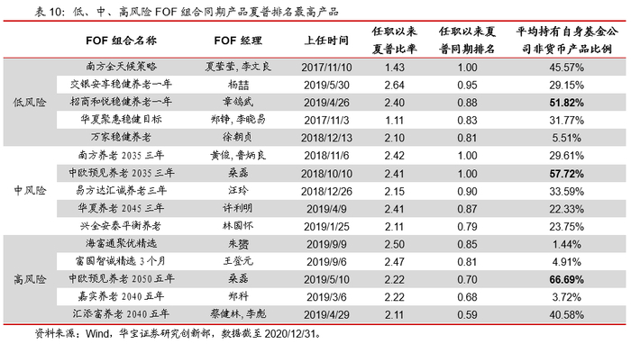 取FOF经理剔除三个月建仓期管理时长满一年的产品,分低、中、高风险三类,将与同期产品业绩夏普相比排名最高的五只FOF产品列示在下表中。值得一提的是,FOF产品在基金选择和配置中,往往会呈现对统一管理人旗下产品更容易沟通和配置的情况,这种策略下,母公司旗下是否具有丰富的优秀基金产品就成为FOF产品的投资收益来源影响因素之一,,因此,下表中我们标注出这些FOF产品是否选择了本公司产品: