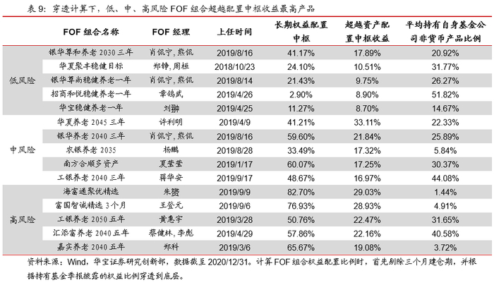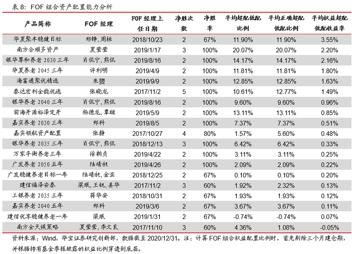由于权益资产自2019年初至今保持增长,相对于比较基准持续超配权益资产的FOF组合才能获得较好的资产配置成绩,因此在上表中所展示的净胜次数较高的产品均为在权益投资上更积极的组合。