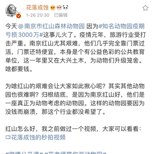1月26日,一条关于“知名动物园亏损3000万”的消息登上了微博热搜,引发了许多网民的关注。事件中的动物园为南京红山动物园,受去年新冠肺炎疫情的影响,该园在2020年一共亏损了3000多万,占到往年收入的40%,员工流失也达到了20多人。