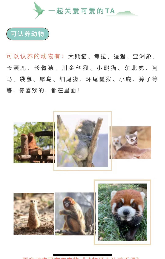 动物爱心认养活动,可以在“南京红山森林动物园”微信公众号内认领。 南京红山森林动物园 图