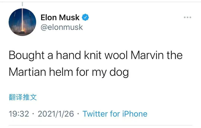马斯克也跑出来带了一大波节奏,先说给自家的狗买了 GameStop 的帽子,