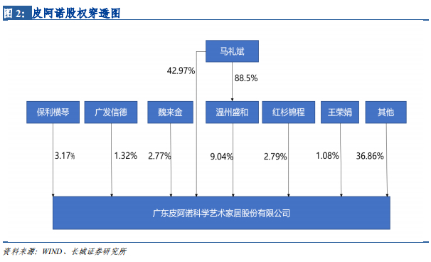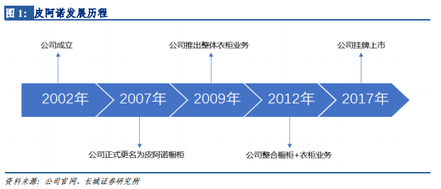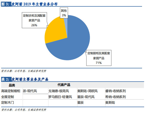 高端定制领域潜心耕耘,品牌护城河逐渐确立。公司成立于2002年,于2017年在深交所挂牌上市。2002年与2007年之间,公司与广东康宝电器有限公司签订品牌战略联盟协议,成立皮阿诺·康宝橱柜,开创了“专业橱柜+专业电器”的行业新模式。2007年,在品牌核心化的诉求下,皮阿诺·康宝正式更名为皮阿诺,2008年皮阿诺被认定为中国驰名商标。2009年公司正式推出整体衣柜业务,于2012年公司将橱柜、衣柜业务彻底整合,“科学家居艺术”战略产业链逐渐生成。经过多年的发展,皮阿诺形成了橱柜+全屋+木门的木作家居业务的产业链配套业务形式,并屡次凭借优秀的设计获得国内外多项设计大奖,专注中高端定制家居市场,是中国中高端定制家居的领头企业之一。