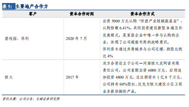 与头部地产商达成“资本+产业”双向合作,持续开拓优质客户。在大宗业务方面,公司与全国前五地产商通过“资本+产业”的形式深度绑定,与恒大集团长期合作,一直作为恒大集团的首选供应商,同时联合恒大集团合资设立了子公司—河南恒大皮阿诺有限责任公司(首期出资6000万元,持股比例60%);与碧桂园、保利集团开展产业链投资合作,出资5000万元认购由碧桂园创投作为普通合伙人,保利资本作为基金管理人的“保碧产业链赋能基金”,认购份额6.41%,共同布局地产—家居产业链,开创B端新型互补发展模式,是家居行业里唯一参与认购的企业,体现了公司超前布局的战略意识。19年引入了保利、阳光壹佰等地产商,20年新增了龙湖、中铁、中梁、远洋、华润地产等优质客户。21年1月公司定增顺利落地,与保利、碧桂园的绑定进一步加深。