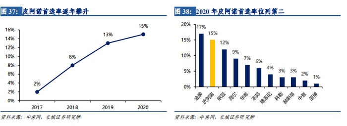 构造直营服务型团队,首选率快速提升。公司对于工程业务的重视度较高,是业内当中少数以直营模式为主服务地产客户的定制家居公司。公司的直营模式主要源于早期与恒大的打磨,公司在与恒大地产的合作过程中,每年都荣获恒大每年唯一的定制橱柜单品的“优秀供应商”称号。目前公司已经建立了约200人的大宗团队,涵盖从设计、拿单到最后运输、落地安装服务的全流程,搭建起了一套完整且标准化的服务体系,不断输出精品工程,在业内已经形成一定的品牌口碑。根据中房网,皮阿诺的首选率已经由2017年的2%提升至2020年的15%。
