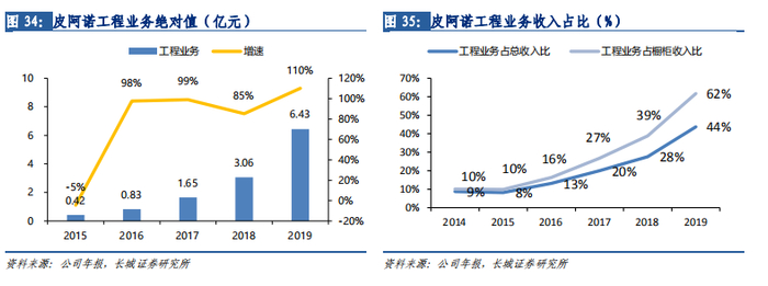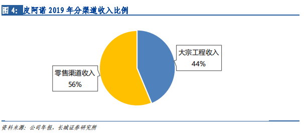公司专注定制业务,“量身定制”是公司的业务核心,公司采购、生产、销售均围绕“量身定制”这一核心业务展开。经过多年发展,公司形成了渠道+大宗+O2O模式的复合营销模式,在行业内的上市公司都专注于ToC业务的同时,皮阿诺较早认准精装房的主要方向,着力发展工程业务,目前工程业务占营收比重以超过50%,同时公司继续发力零售渠道建设,19年已建成高端门店30家,新建门店395家。逐步形成了零售+大宗双轮驱动营收的战略模式。