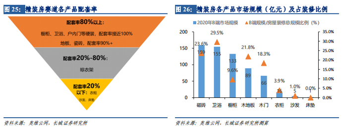 精装房配套率较高的产品工程赛道迎来爆发。根据奥维云网,精装房配套品分为一级、二级、三级配套。其中一级配套品的配套率较高,一般在80%以上,当前主要包括橱柜、瓷砖、卫浴、木门、木地板等硬装产品,这些产品受益于政策推动,在工程端的增长弹性较高,而与此同时C端也承受较大的压力,配套率较高的产品只有积极参与行业流量变革才能维持增长。