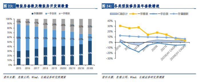 精装房渗透率提升对于地产后周期的家具行业意味着C端流量被挤压。精装房的推行使得客流量在房屋购置层面被截留,短期内C端流量中的一手房装修流量被严重挤压。根据测算,精装房装修占比从2015年的11%上升至2020年的26%;而一手房自行装修的比例由2015年的58%占比下滑至2020年的33%。随着政策推动,一手房精装修套数的增速较高,而一手自装房将出现长期负增长。