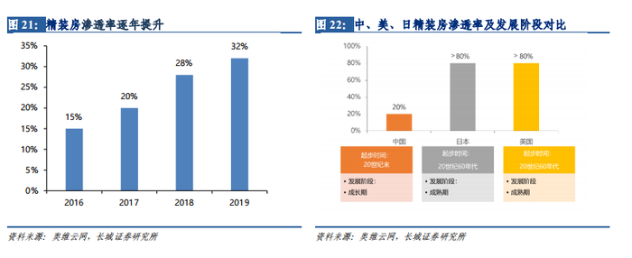 在政策的催化下,精装房市场快速放量,对标海外仍有广阔空间。根据奥维云网,2016年以来精装房套数快速提升,2017年、2018年分别同比+37%、60%,2018年达253万套;精装房渗透率也由2016年的15%提升至2019年的32%(奥维云网预计值),渗透率的快速提升带动精装房产业链市场规模快速放量。长期来看,我国精装房渗透率有望对标美国、日本,达到80%以上,精装房产业链放量的持续性和确定性较强。
