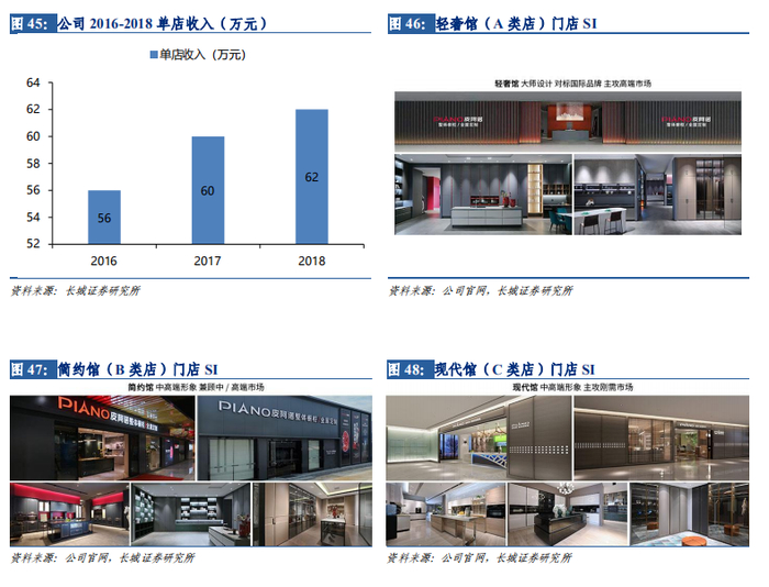 终端门店全面升级,提升单店销售。2019年,公司对终端门店进行系统梳理和提升,升级终端门店形象展示SI系统,并将终端门店划分为A类店(轻奢馆)、B类店(简约馆)、C类店(现代馆),强化终端门店的中高端市场定位。其中A类店(高端店)产品结构为80%高端产品+20%中端产品,店面形象由国际设计师进行设计;B类店(主流中高端店)产品结构为30%高端产品+50%中端产品+20%低端产品构成,门店由国内顶级设计师设计;C类店(补充中高端店)产品结构为50%中端产品+50%低端产品,门店由公司设计师设计。2019年公司新建纯高端店30家,整改重装门店127家;20年新建纯高端店在50家以上。清晰的门店层级划分令公司可以根据不同城市、不同卖场进行更有针对性的产品陈列,提升门店运营效率。从2016-2018年(2019年统计口径改变,不具有可比性),公司单店收入从56万元提升至62万元,预计随着门店的升级优化及综合店的铺设,单店收入有望继续提升。