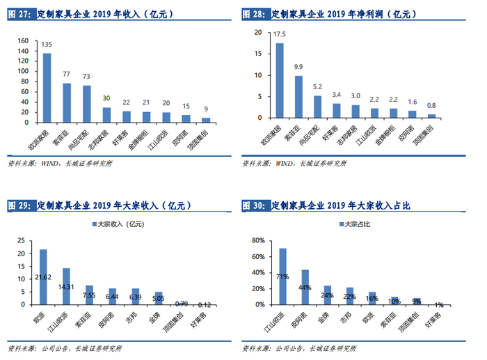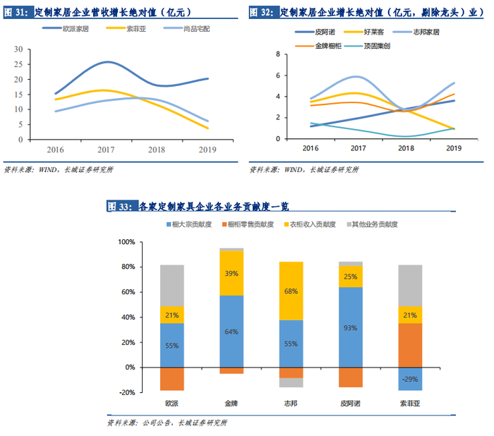 品类扩张+大宗渠道驱动二线“橱柜系”快速扩张。从动态变化来看,第一梯队当中索菲亚、尚品宅配2018、2019年的绝对值增长承受较大压力,主要受到橱柜系进军衣柜板块的冲击。第二梯队当中出现明显分化,拥抱大宗且向衣柜顺利导流的橱柜系包括志邦、金牌、皮阿诺增长较快,其橱柜大宗和衣柜对收入增长的贡献度基本都超过100%,是拉动收入增长的主因。几家二线橱柜系品牌收入增长绝对值已经逼近甚至超越第一梯队的索菲亚、尚品宅配。