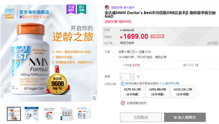 此前在电商平台上,NMN的产品售价几百至几万元不等,且均为国外进口品牌。如果一瓶NMN含量是60粒,每天需服用2粒,按照2月—3个月见效的说法,大概需要服用3瓶左右,按其每瓶3000元左右计算,需花费一万元左右才能有一定效果。
